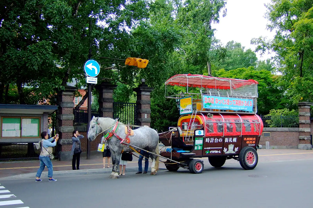 Toa xe có mái che Sapporo màu đỏ đã hoạt động kể từ năm 1978 và mang lại cảm giác hoài cổ. Không có nhiều nơi ở Nhật Bản mà bạn có thể đi vòng quanh khu văn phòng bằng ngựa và xe ngựa. Vậy nên, toa xe có mái che Sapporo sẽ là một cách tuyệt vời để tham quan thành phố. Có một điểm dừng ngay sau khi ra khỏi Lối ra số 5 của Ga Tàu điện ngầm Odori.