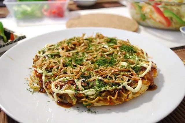 Aonori thường được rắc lên trên bánh xèo okonomiyaki để tăng thêm màu sắc và hương vị